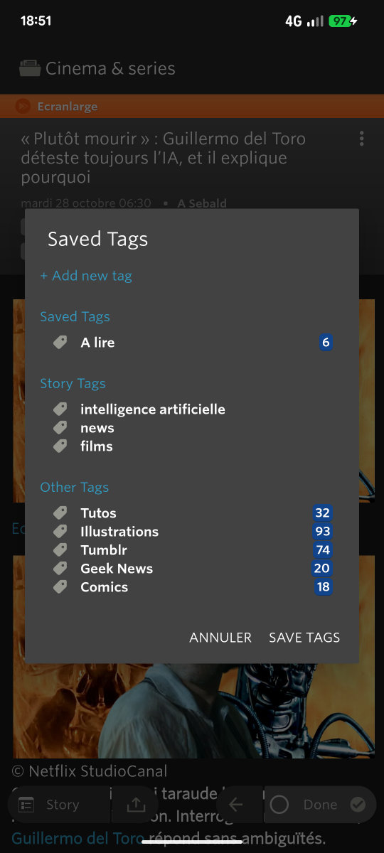 On android there’s 2 problems since the last update, one with saving stories and tags: it seems not possible anymore to attribute an existing tags to a story saved, it’s only possible on the web (and need to be unsaved first, then re-saved otherwise it goes on “highlight”)
