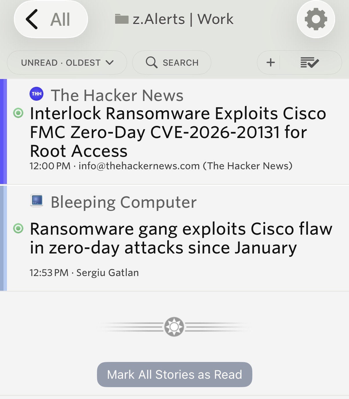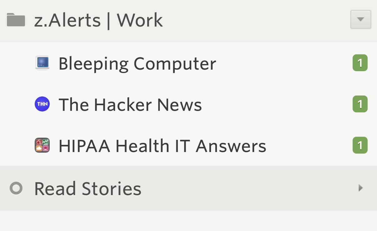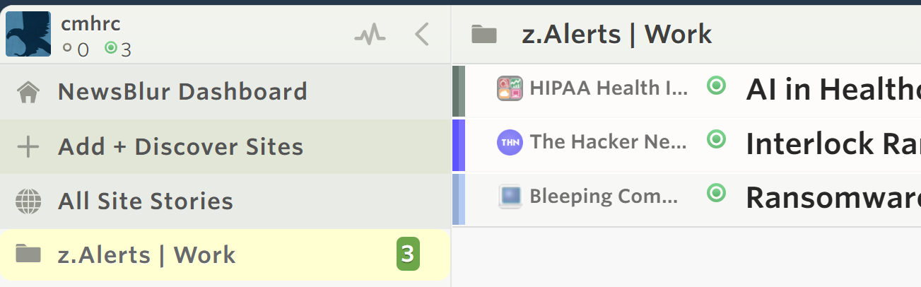 On my iPhone 17 running NewsBlur v14.1 (319), I see three unread articles in the folder list…
