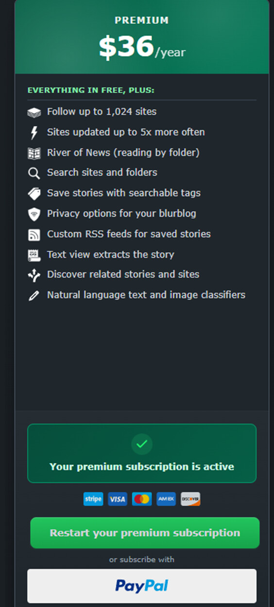 So I am confused. Payment never happened and on one page it shows my account should have been downgraded. But on another page it shows my subscription is still active. I have no records from paypal of the payment ever being attempted. Screen shot below. My newsblur username is Sleepylizard.