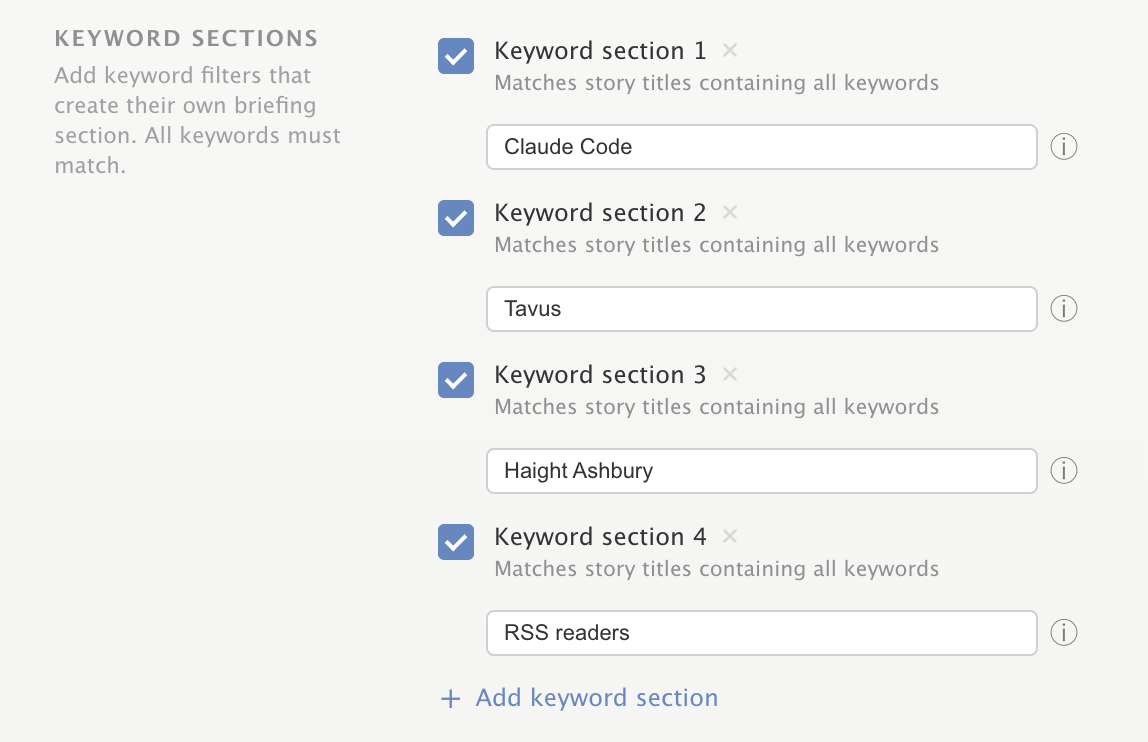 On top of the built-in sections, you can add up to five custom keyword sections. Type a keyword or phrase and NewsBlur uses Elasticsearch to find matching stories across your feeds, then a dedicated section is written for them. If you always want a section about “climate change” or “Apple earnings,” just add the keyword and it appears in every briefing when there’s stories that match.