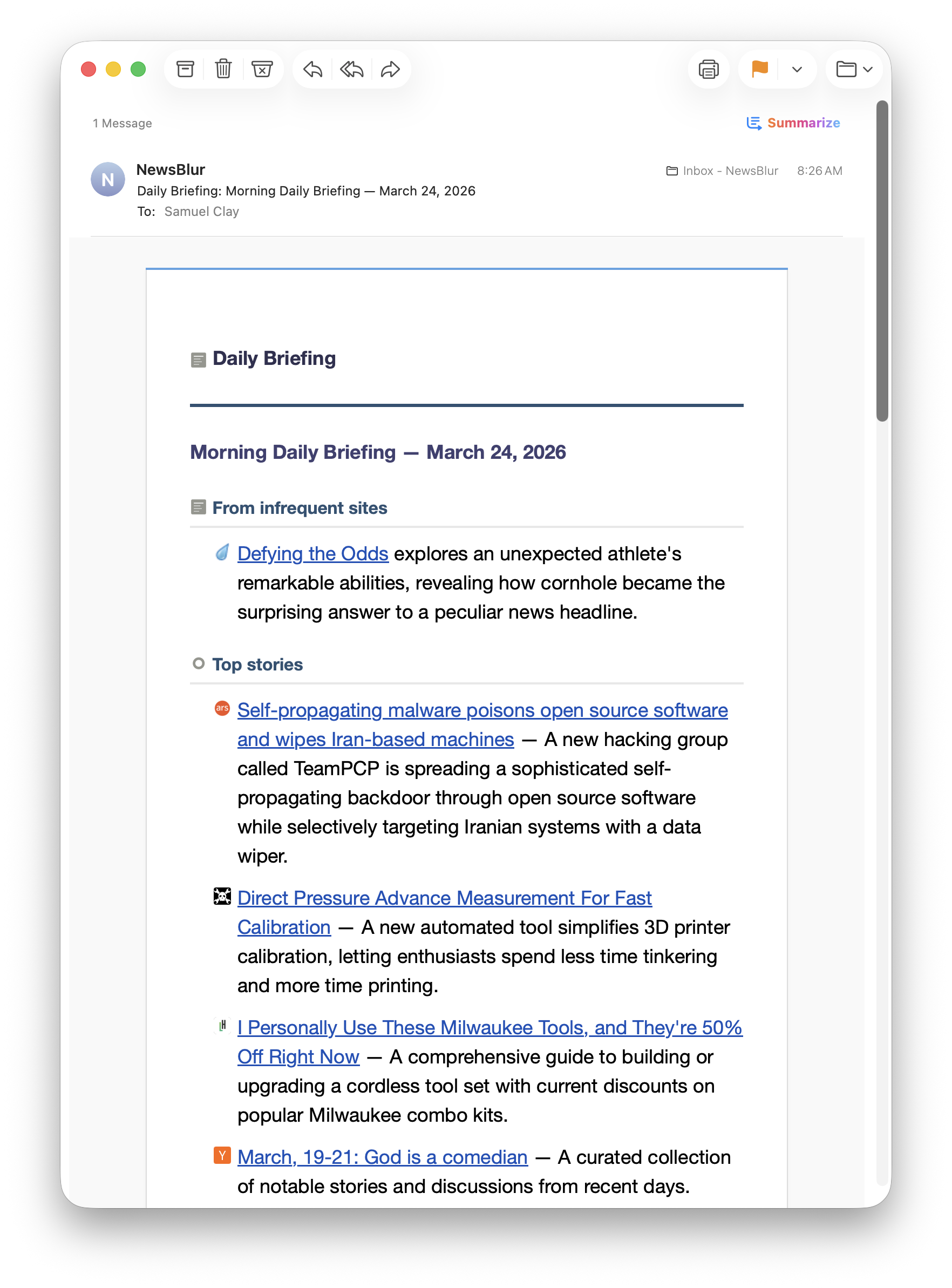 That’s the Daily Briefing. It reads your feeds, scores every story, and writes a personalized summary organized into sections that make sense for the way you read. It shows up as a feed in your sidebar, and you can have it emailed to you on a schedule you control.