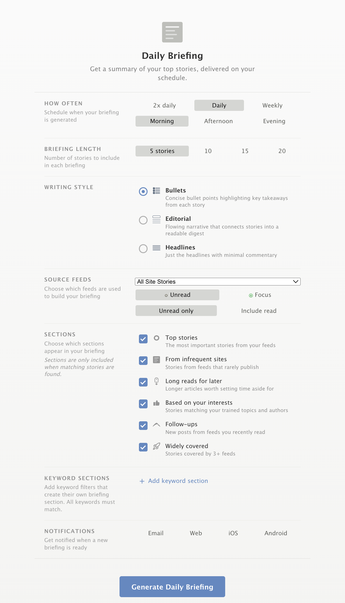 You can enable or disable any of these sections, and drag to reorder them so your briefing is organized the way you want. If you only care about top stories and classifier matches, turn off the rest.
