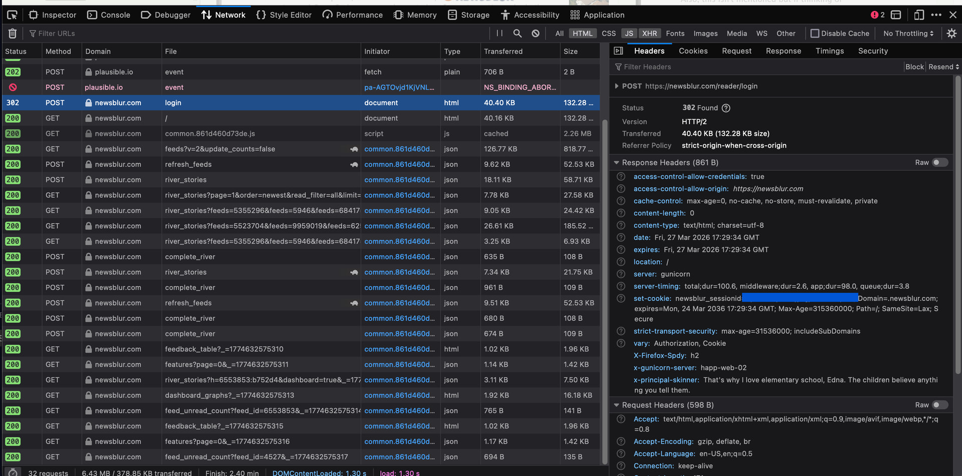 Then try logging in and send me the logs of the actual post request. Notice I selected only HTML/JS/XHR. You should see a POST method request to /login.