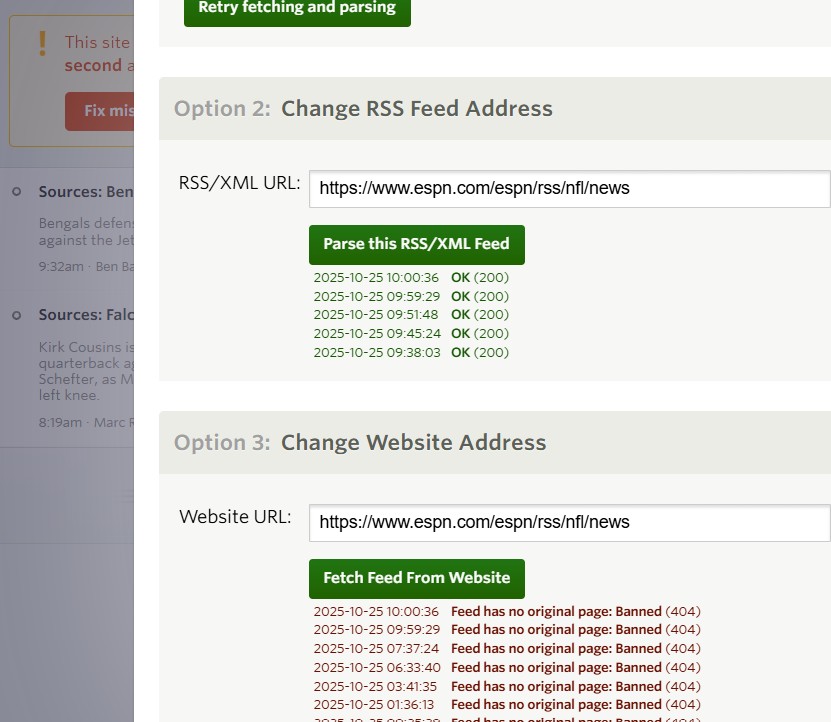 I like the new warning (shown behind) but it still seems to be working…? Not sure why one part shows “Banned” but the other shows “OK” and it’s still pulling articles…?