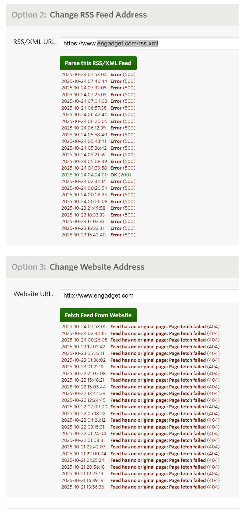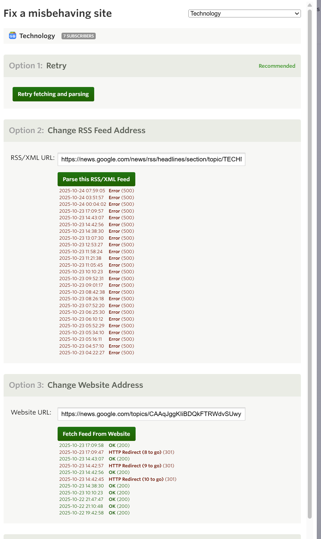 Fantastic, thanks for the thorough write-up. Turns out it was hard to diagnose because there were 2 servers down at the same time! I couldn’t recover them immediately, but I fixed where feed fetch would fail. Should be OK starting now and will eventually re-enable inadvertently disabled sites over the next day.