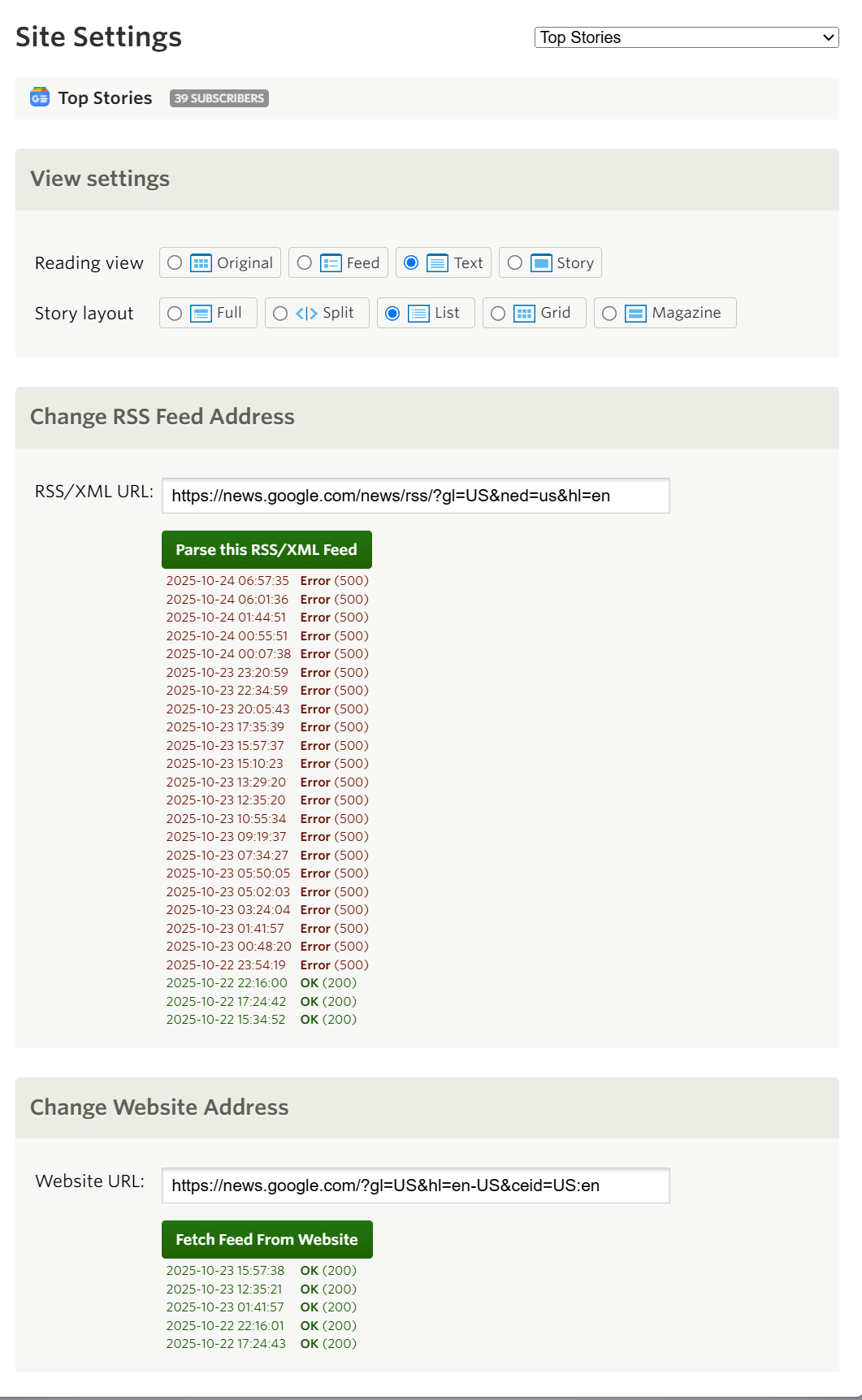 Other feeds (say google top stories feed) should have 50-100 items in the feed after a few hours, but if i click that individual feed right now it will show no items as new. Going to feed details shows errors but the same settings worked two days ago.