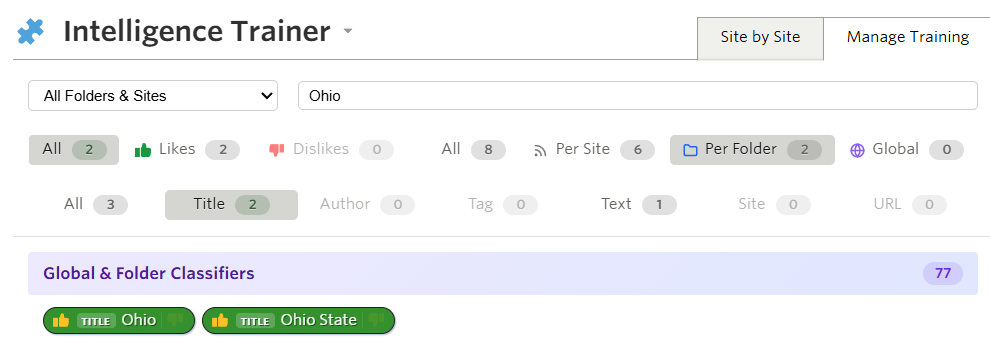 Hi Samuel. I need some help…I searched for “Ohio” in “All Folders & Sites” but how can I tell where (folder or feed) I initially applied the “Ohio” title? The purple header says “Global & Folder Classifiers” but the “Per Folder” says 2 and “Global” 0. Thank you.