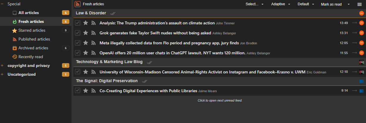 I’m very fond of this feature in the self-hosted reader tt-rss, which I’m hoping to get away from. Another nice feature is that each feed heading has its own “mark all as read” button (the double-checkmark in the screenshot).