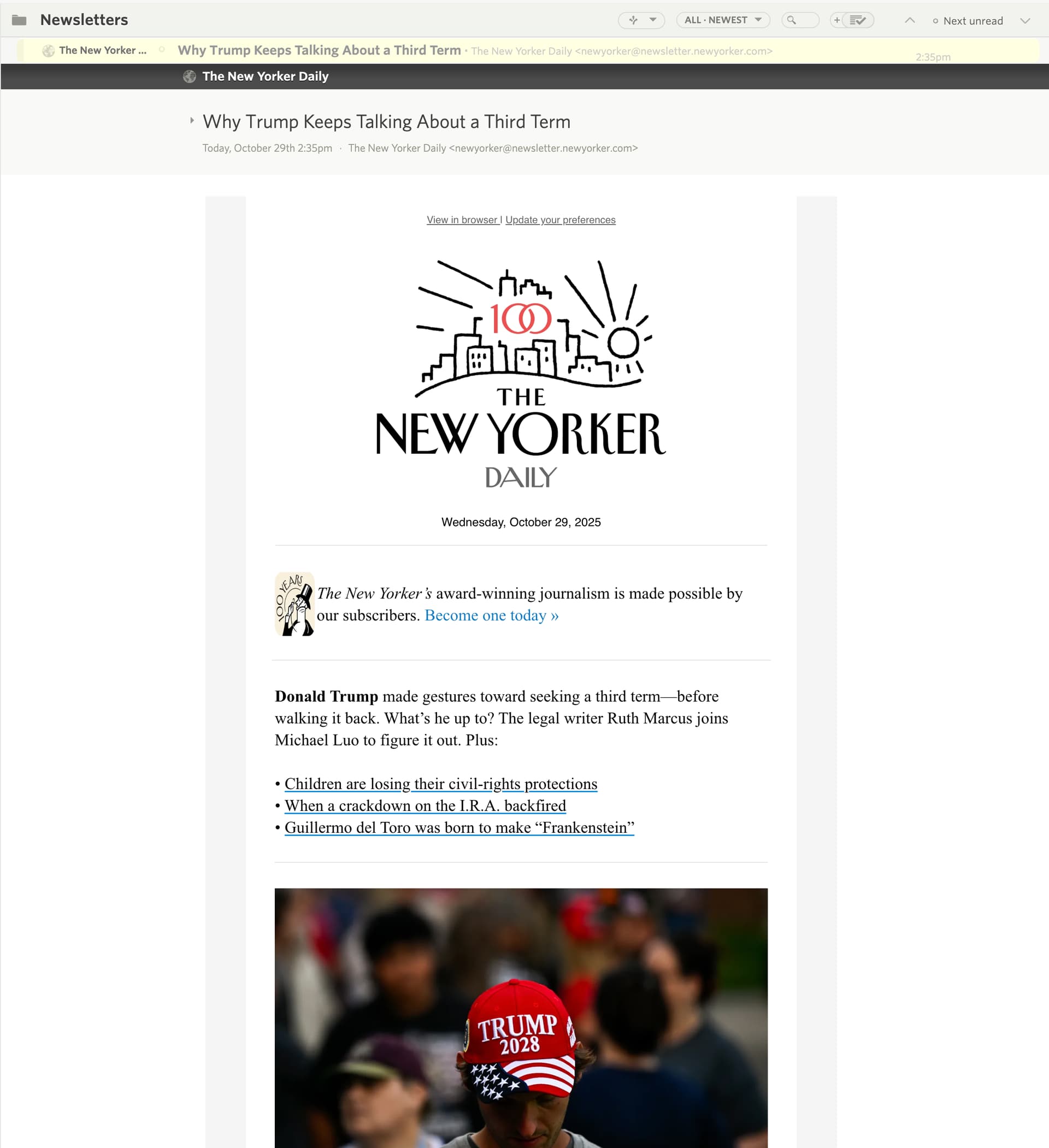 First I want to say that I have been using Newsblur for years and it’s been such a fantastic experience. I have been using Newsblur to read my newsletters and only New Yorker (sent from newyorker@newsletter.newyorker.com) shows up blank. The newsletter title shows up correctly but there is no content whatsoever.