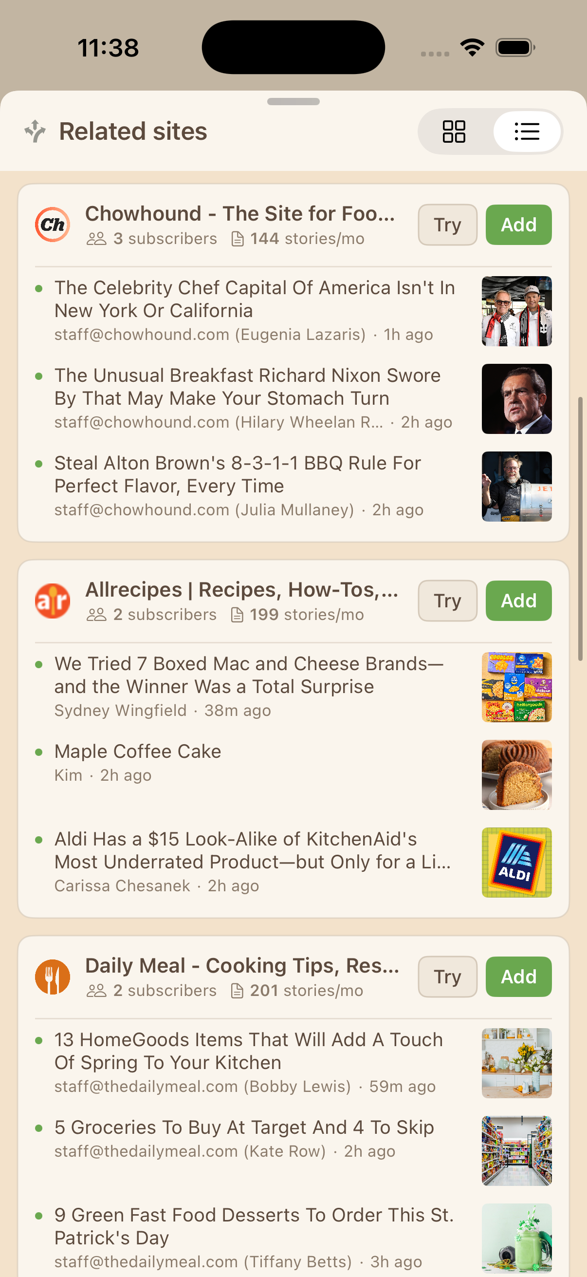 Two new story layout options join the existing Grid view. List shows compact rows for scanning headlines quickly. Magazine shows taller rows with larger thumbnails, giving you a richer preview of each story without opening it. Switch between them from the story titles pill bar.