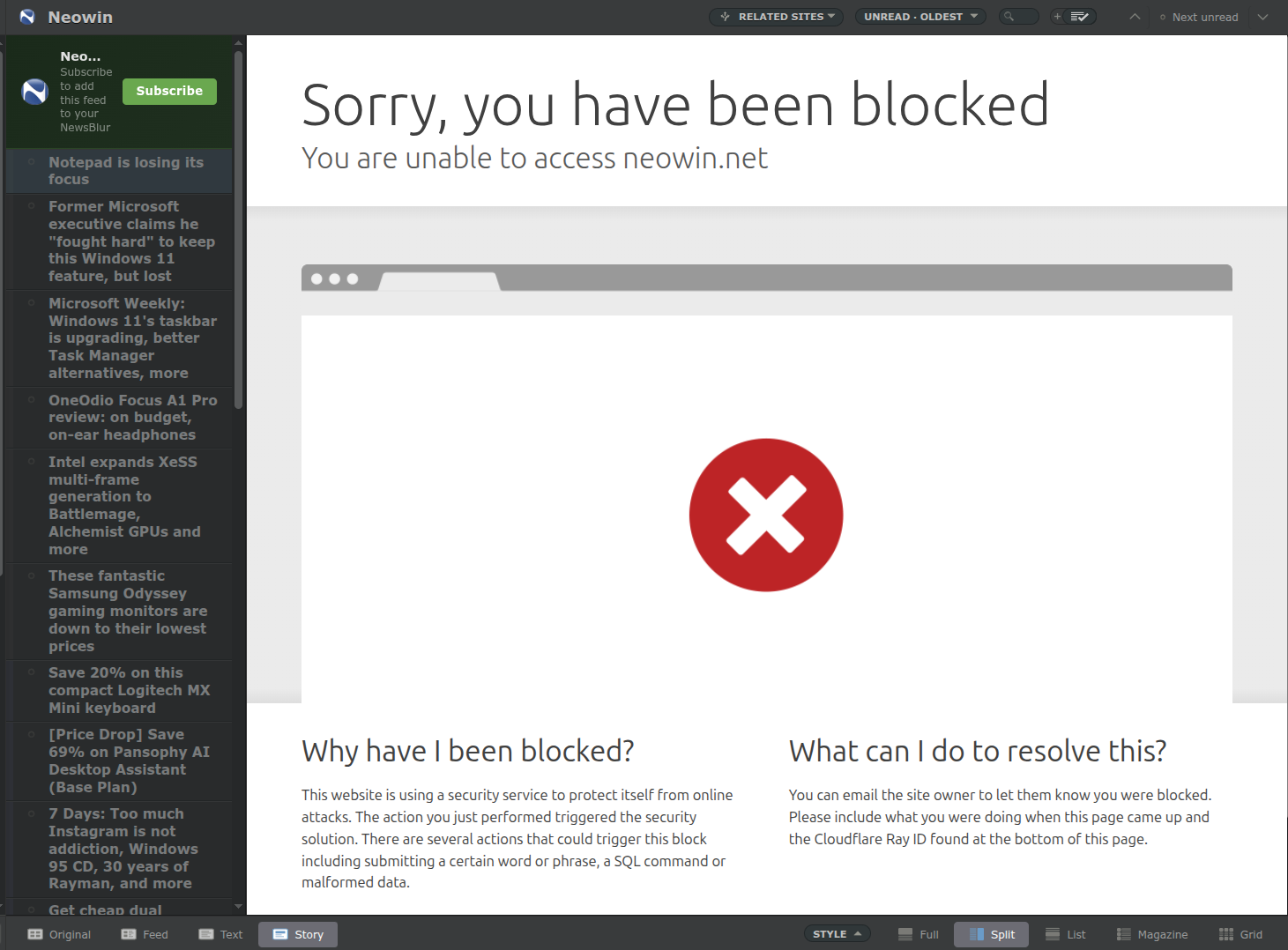 Just wanted to let you know that NeoWin (https://www.neowin.net/news/rss) blocks NewsBlur.