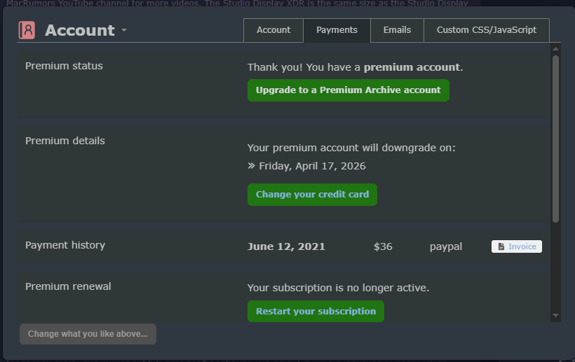 So I see the renewal date. Awesome. However the check box is still not there. Iâve been debating whether to upgrade or to self host it. I do remember a while back you said my account could be a problem if I moved over to premuim archive due to how active the account is. Screen shot attached.