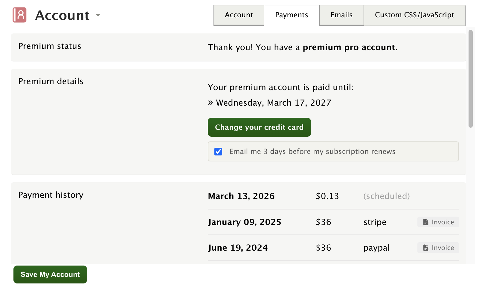 That said, I hear you, and Iâve gone ahead and added this. Thereâs now an opt-in checkbox in your Account settings under the Payments tab, right below âChange your credit card.â If you check âEmail me 3 days before my subscription renews,â youâll get a courtesy heads-up three days before the charge goes through. Itâs off by default, so nothing changes for anyone who doesnât want it.