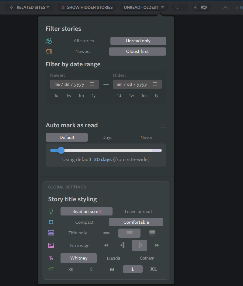 Sorry to revive this after a year, but I was wondering what the status is? I just had a situation where I remembered seeing a new trailer in a folder, but forgot to save it. I searched “trailer” and it found every article with trailer in the title from the history of the feeds. This is fantastic, but looking for something that I saw today is kind of hard when I’m seeing things from 2016. I then tried to first apply the feed filters before searching. The filters disappeared as soon as I tried to search.