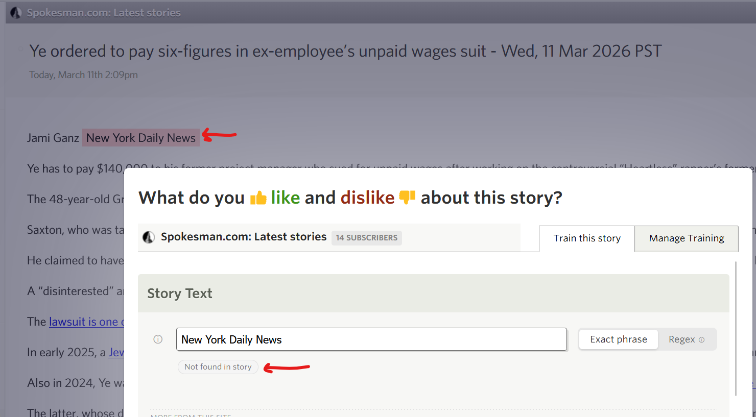 domain: spokesman.com, I have trained to dislike ‘New York Daily News’, the text does highlight as disliked but the training tool shows as ‘not found in story’: