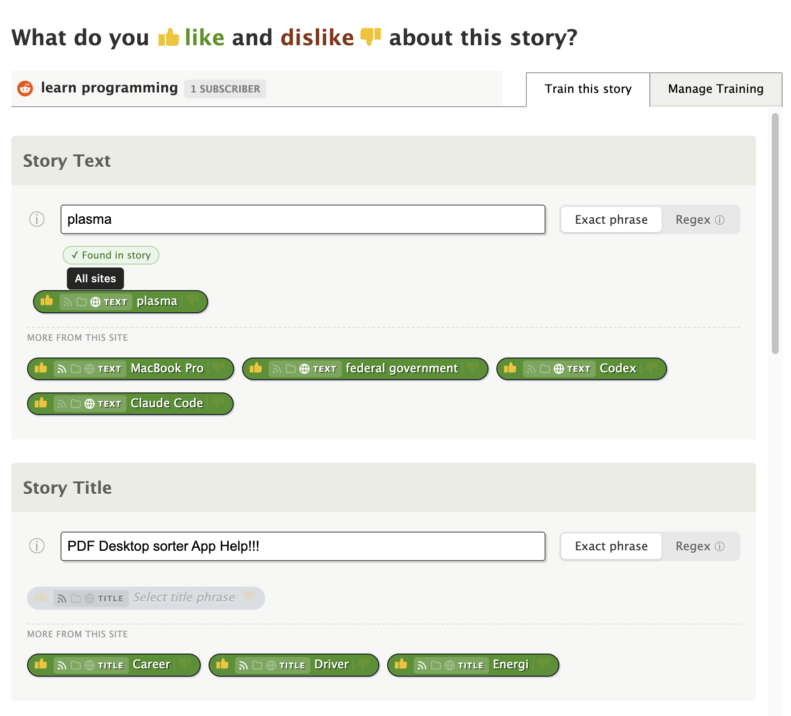 All classifier types are supported: titles, authors, tags, text, URLs, and regex. You can manage everything from the new scope filter in the Manage Training tab.