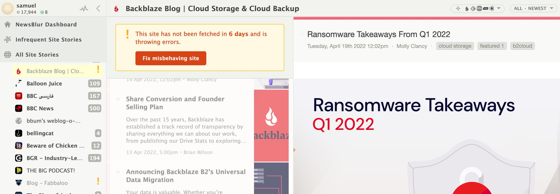 (Why is it not possible to click a misbehaving feed and access its items, they could be relevant even if the feed has gone away.)