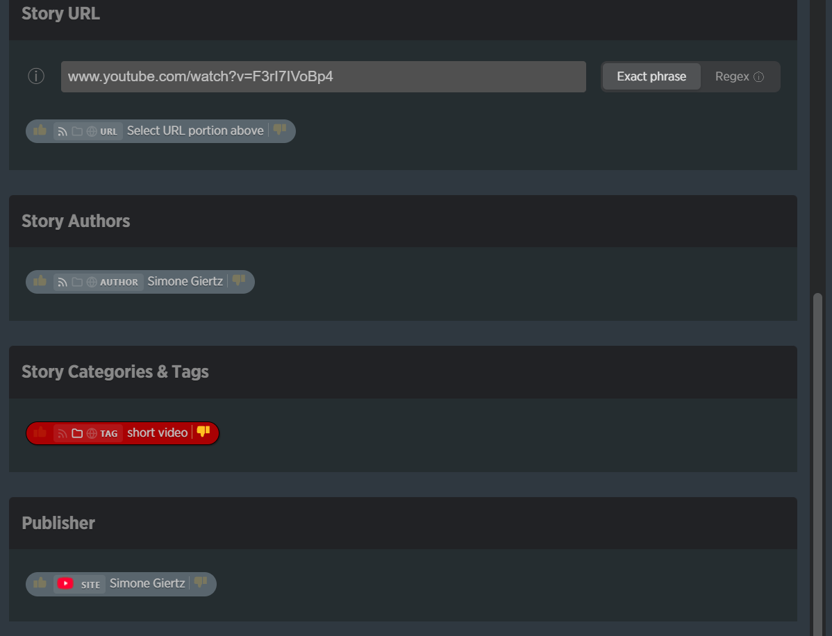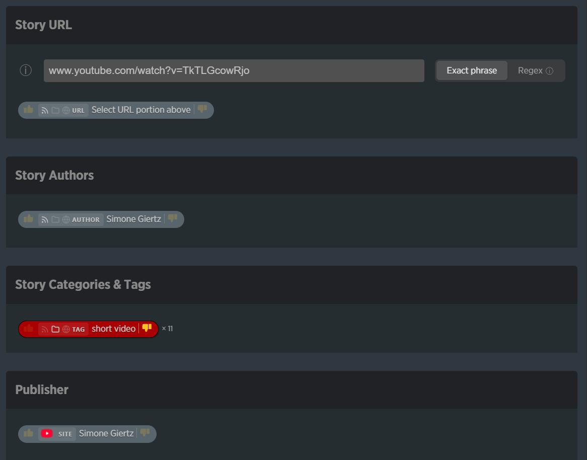 I’ve fixed it so story tags now pick up their counts from the feed data. So you’ll see “short video x 11” whether or not the current story has that tag. The trainer already separates story-specific tags from other feed tags with a “More from this site” divider underneath, which should make it clearer which tags belong to the current story vs. tags available across the feed.